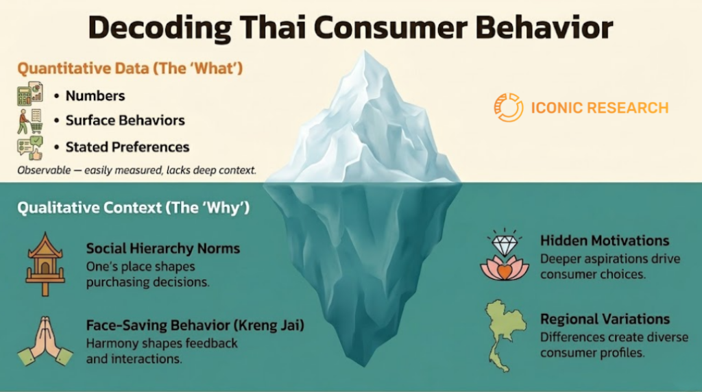 In Thailand, qualitative depth is essential for validity. Cultural factors like social norms, face-saving behavior, and hierarchical communication shape responses in ways quantitative data alone cannot reveal. Satisfaction survey scores might not predict loyalty without cultural context. Stated preferences often diverge from observed behavior.